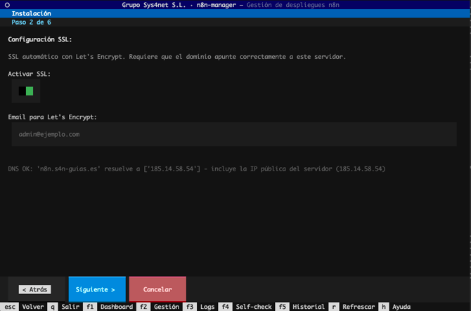 Después, podrás elegir si quieres activar un certificado SSL para acceder a n8n. Para ello, será necesario que el dominio introducido previamente apunte a la IP del servidor. El instalador te lo indicará en la parte inferior con la línea DNS OK: ....