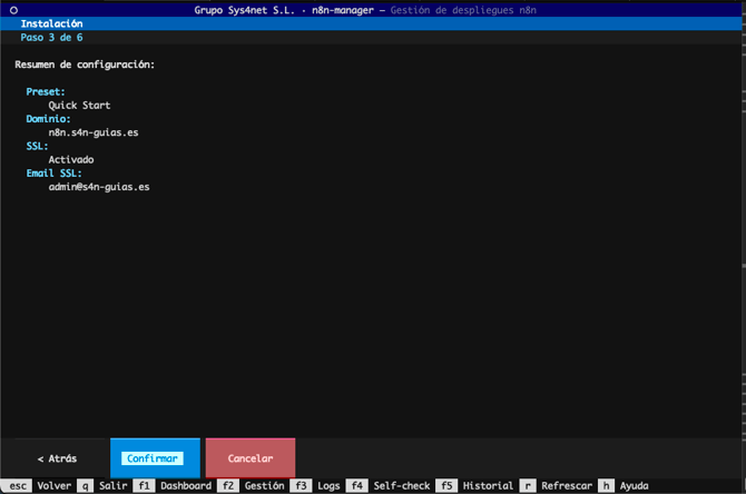 sudo n8n-manager, tal y como se indica en el mensaje de la captura anterior, y elegimos el tipo de instalación Quick Install.
