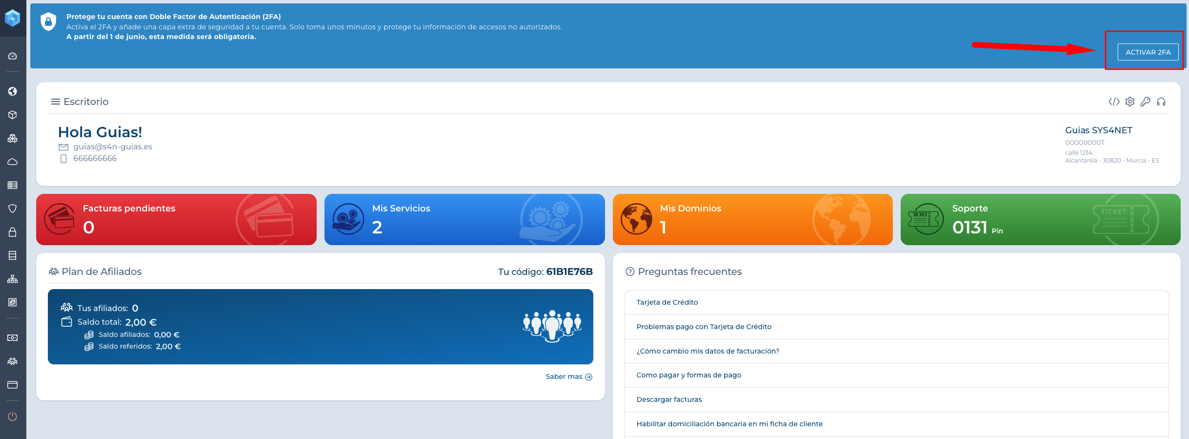 El MFA (Multi-Factor Authentication) es una capa adicional de seguridad que protege tu cuenta más allá de la contraseña tradicional. Cuando actives esta función, cada vez que inicies sesión en tu área de cliente, recibirás un código de verificación en tu correo electrónico que deberás introducir para completar el acceso.